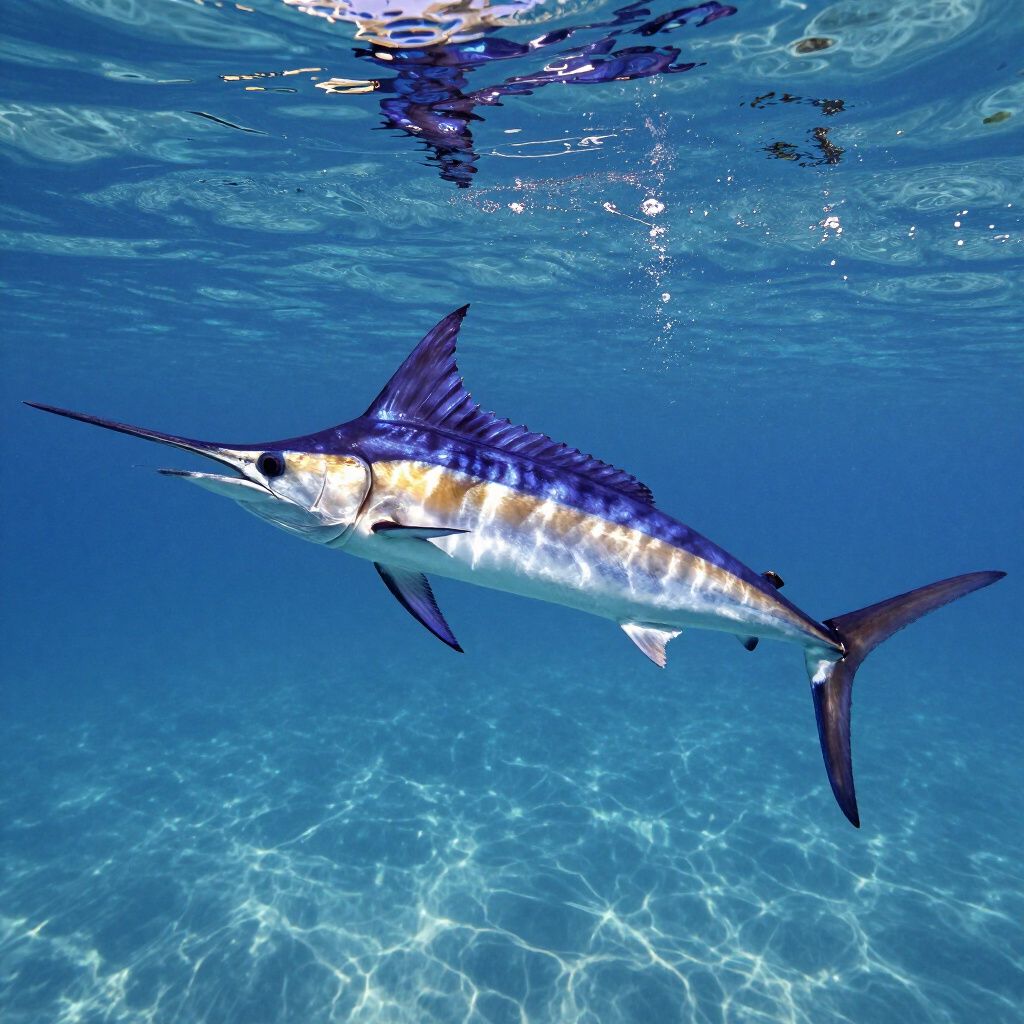 The Atlantic White Marlin, also known for its striking appearance, features a dark blue to chocolate brown upper body that transitions to a silvery-white belly. Its elongated upper jaw resembles a spear, making it a unique sight in the waters. The first dorsal fin is blue-black, adorned with small black spots, while the other fins are brown-black.