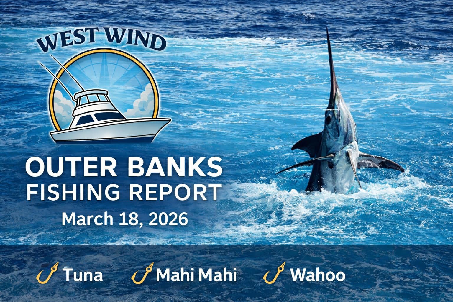 π£ West Wind Charter — Captain Olan West March begins with classic early-season Outer Banks conditions — bright sunshine, cool air, and changing afternoon winds signaling the gradual transition toward spring fishing. βΈ» π€οΈ Weather & Ocean Conditions • Temperature: 40°–54° • Conditions: Sunny skies with increasing afternoon wind • Wind: Light early, becoming breezy later in the day • Precipitation: 0% chance • Overall Outlook: Improving visibility and favorable offshore windows developing Cool mornings continue, but warming daytime temperatures are helping stabilize offshore waters. These seasonal shifts often trigger increased pelagic movement along the Gulf Stream edge. βΈ» π Fishing Outlook The Gulf Stream remains the key focus as offshore temperatures hold productive ranges for early tuna opportunities. Anglers are watching for: • Bluefin Tuna activity offshore • Yellowfin opportunities as water temperatures stabilize • Increasing bait presence along temperature breaks As March unfolds, fishing typically transitions from winter patterns toward more consistent offshore action. βΈ» π Captain’s Report Conditions are lining up for exciting early-season runs. Sunny weather improves travel conditions to the stream, and each warming trend increases the chance of strong tuna bites. Spring momentum is officially underway on the Outer Banks. βΈ» β Fun Fact — Gulf Stream Tuna Did you know tuna can maintain body temperatures warmer than the surrounding ocean? This unique adaptation allows tuna to swim faster and hunt efficiently in the powerful Gulf Stream currents — which is why the waters off the Outer Banks are considered one of the best tuna fisheries on the East Coast. βΈ» β Book Your 2026 Offshore Adventure The season ahead is shaping up beautifully. π Book your trip here π Sailing from Oregon Inlet Fishing Center